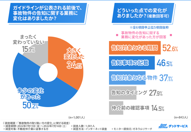 「ガイドラインが公表される前後で、事故物件の告知に関する業務に変化はありましたか?」と質問したところ、『大きく変化した(34.1%)』『多少の変化があった(50.2%)』『まったく変わっていない(15.7%)』との回答結果になりました。