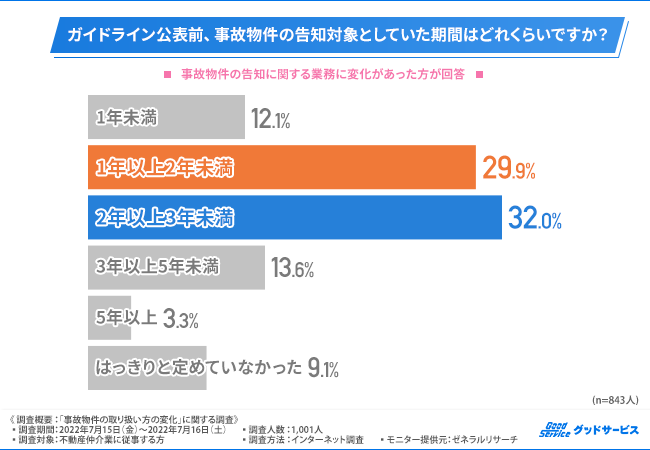 「ガイドライン公表前、事故物件の告知対象としていた期間はどれくらいですか?」と質問したところ、『2年以上3年未満(32.0%)』と回答した方が最も多く、次いで『1年以上2年未満(29.9%)』『3年以上5年未満(13.6%)』と続きました。