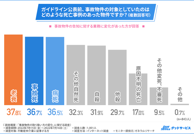 「ガイドライン公表前、事故物件の対象としていたのはどのような死亡事例のあった物件ですか?(複数回答可)」と質問したところ、『老衰(37.8%)』と回答した方が最も多く、次いで『事故死(36.7%)』『病死(36.5%)』と続きました。